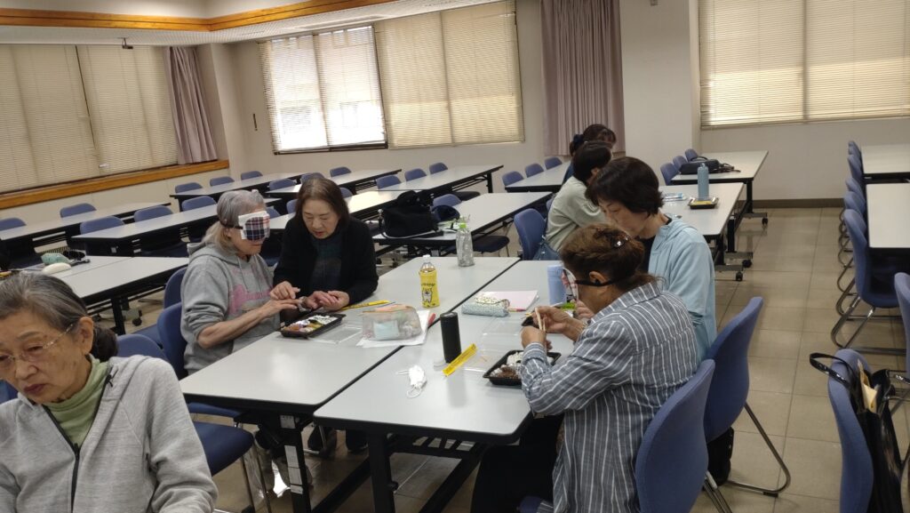 実習では、アイマスクと耳栓をした盲ろう者役と支援者に分かれて実際にお弁当を食べてもらいました。